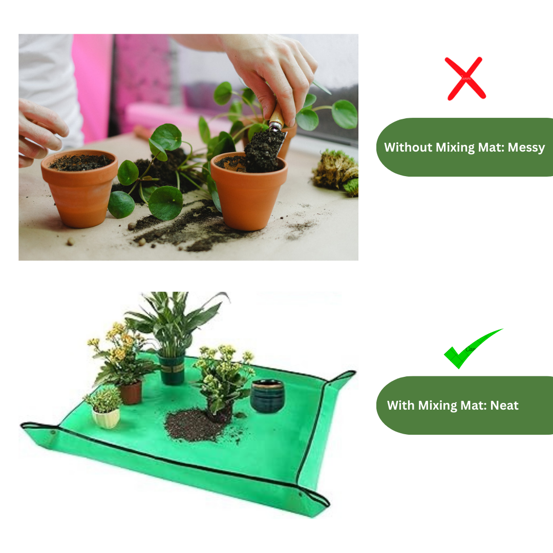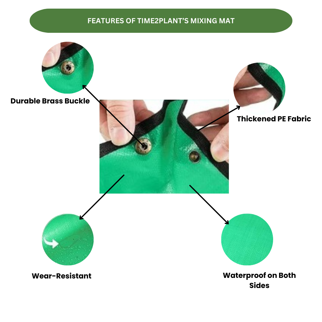Soil Mixing Mat a versatile solution for all your gardening endeavors. Crafted from thick, High-Density Polyethylene (HDPE) waterproof fabric, our mats offer dual-sided waterproofing and effortless cleaning. With buckles on each corner, they effectively contain water and dirt, ensuring your floors and tabletops remain pristine. Perfect for early spring sowing, transplanting, seedling nurturing, and more, these mats streamline your gardening tasks. Assembly is a snap, and cleanup is a breeze with a damp cloth. Save time, conserve potting soil, and maintain workspace tidiness effortlessly. With its foldable design, our replanting mat fits conveniently in your gardening tool bag. Embrace convenience and efficiency in your gardening routine with the Time2Plant Planting Mat.